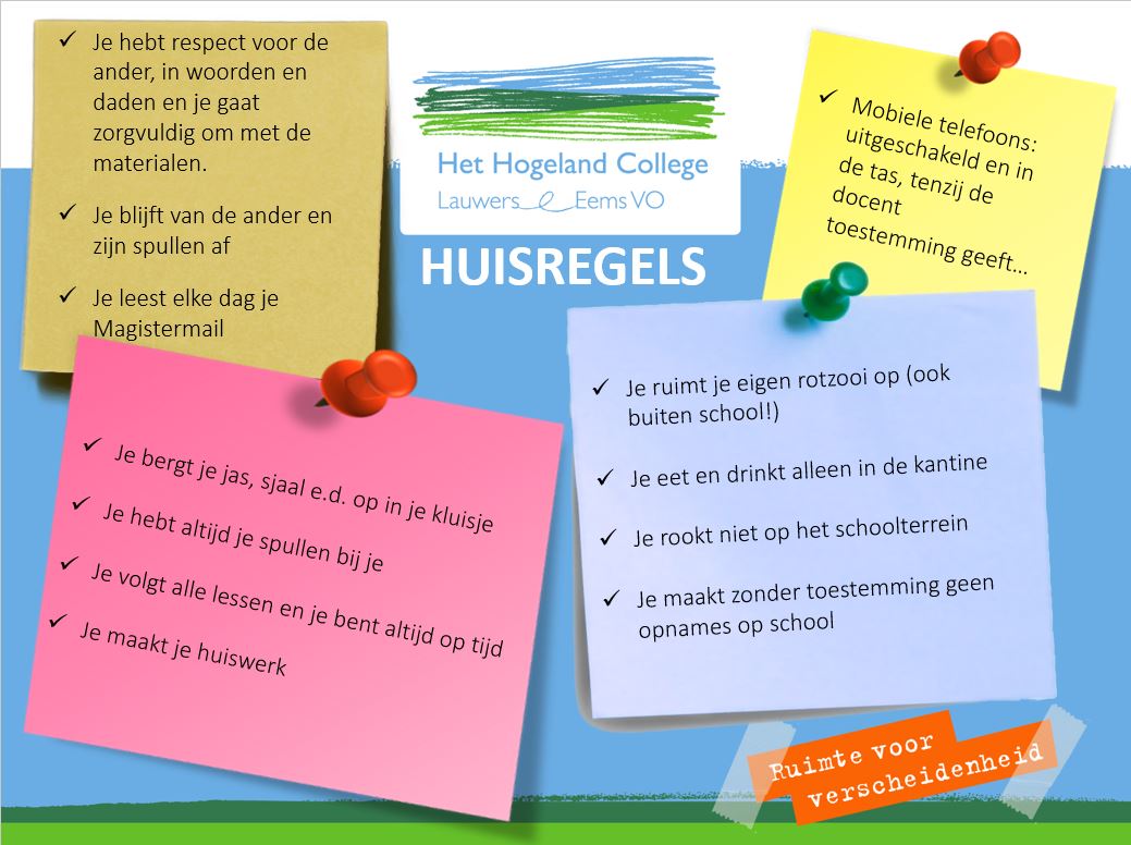 Het klinkt misschien wat zwaar: 'regels'. Dat hoef je niet zo te ervaren. Waar het op neer komt is dat we op school elkaar ruimte geven en respect hebben voor elkaar en elkaars eigendommen. Ook verwachten we van je dat je enige inspanning levert om het gebouw opgeruimd en netjes te houden. Dis je laat je afval achter waar het hoort. En uiteraard ben je op tijd aanwezig in de les.